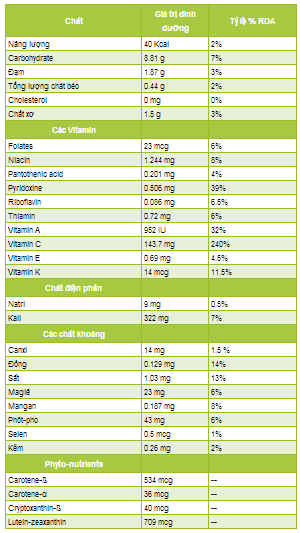 | Bảng giá trị dinh dưỡng của ớt trong: 100g ớt (Nguồn: Cơ sở dữ liệu Dinh dưỡng Quốc gia Mỹ USDA) |